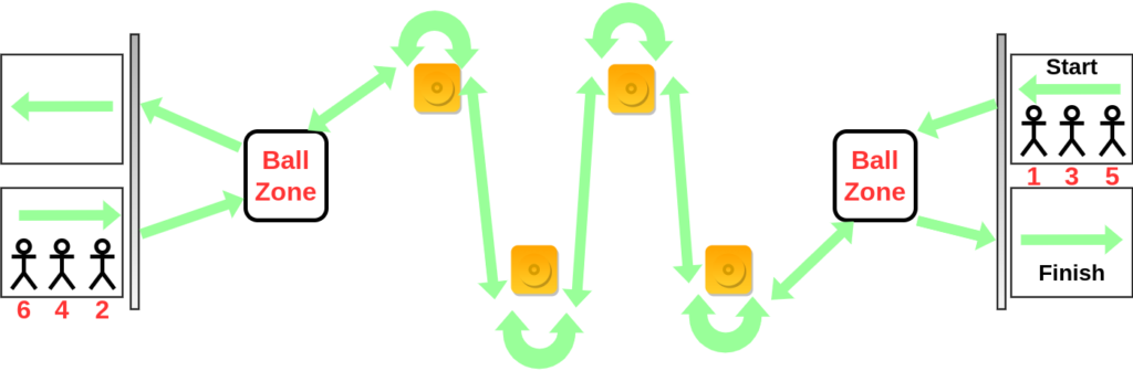 The six participants may participate in any male/female order. Two start zones (see diagram) will be identified with pylons. Participants 1, 3 and 5 will be located at the first start point.