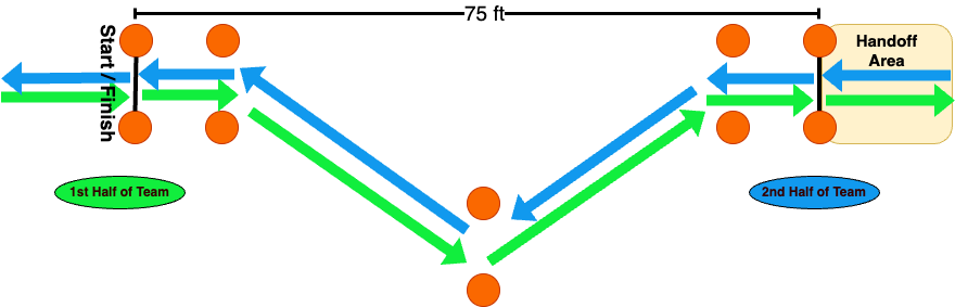 - The remaining four-team members will be positioned at the exchange line. The groups of four will exchange positions once the first group and the skis have completely crossed the line. The second group of four must advance the skis back through the course, including traveling through the offset pylons before proceeding to the start/finish line.